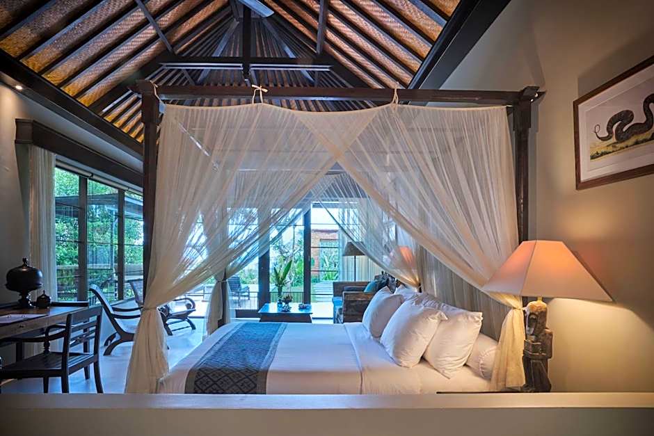 Surrounded by lush tropical garden, this Balinese style villa is fitted with crafted hardwood furniture and local antiques paired with all of the modern amenities. This villa also comes with an open-air bathroom.